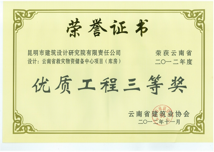 “云南震災(zāi)物資儲(chǔ)備中心項(xiàng)目(庫(kù)房)”榮獲省2012年度優(yōu)質(zhì)工程三等獎(jiǎng)
