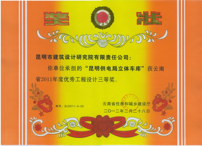 “昆明供電局立體車(chē)庫(kù)”獲云南省2011年度優(yōu)秀工程設(shè)計(jì)三等獎(jiǎng)