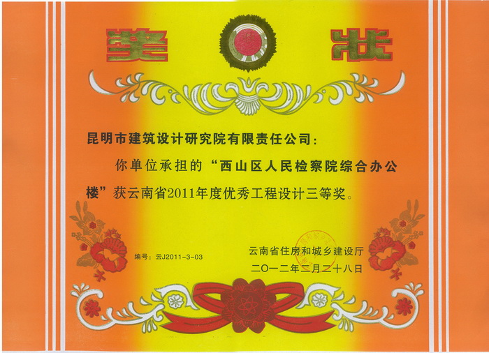 “西山區(qū)人民檢察院綜合辦公樓”獲云南省2011年度優(yōu)秀工程設(shè)計(jì)三等獎(jiǎng)