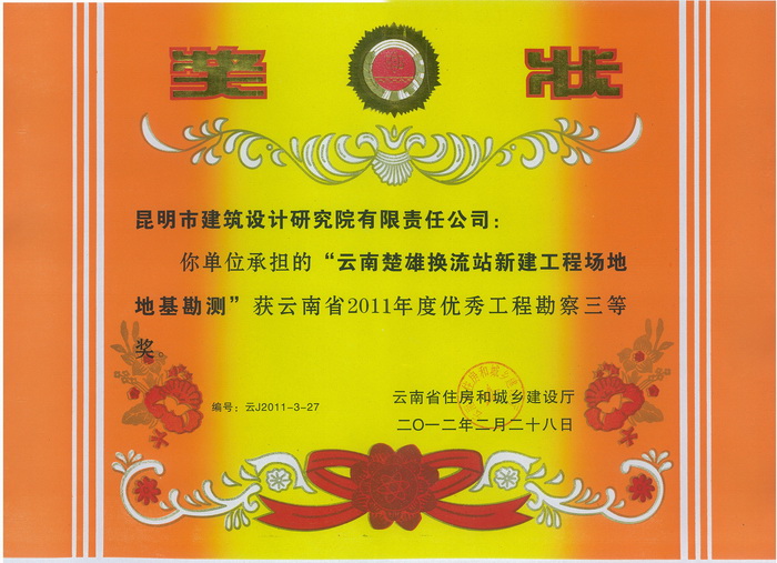 “云南楚雄換流站新建工程場(chǎng)地地基勘測(cè)”獲云南2011年度優(yōu)秀工程勘察三等獎(jiǎng)