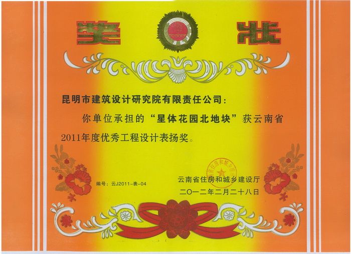 “星體花園北地塊”獲云南省2011年度優(yōu)秀工程設(shè)計(jì)表?yè)P(yáng)獎(jiǎng)