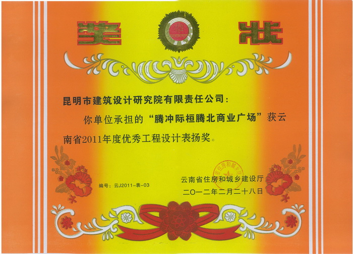 “騰沖際恒騰北商業(yè)廣場(chǎng)”獲云南省2011年度優(yōu)秀工程設(shè)計(jì)表?yè)P(yáng)獎(jiǎng)