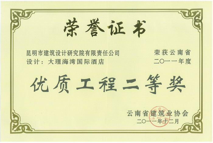 “大理海灣國(guó)際酒店”獲云南省2011年度優(yōu)質(zhì)工程二等獎(jiǎng)